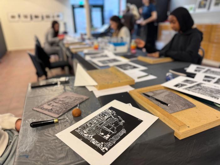 Elevene har latt seg inspirere av vandreutstillingen “Orfeus og Eurydike” med linosnitt av kunstneren Palle Nielsen - og har laget egne linosnitt med veiledning fra kunstner Marianne Karlsen.