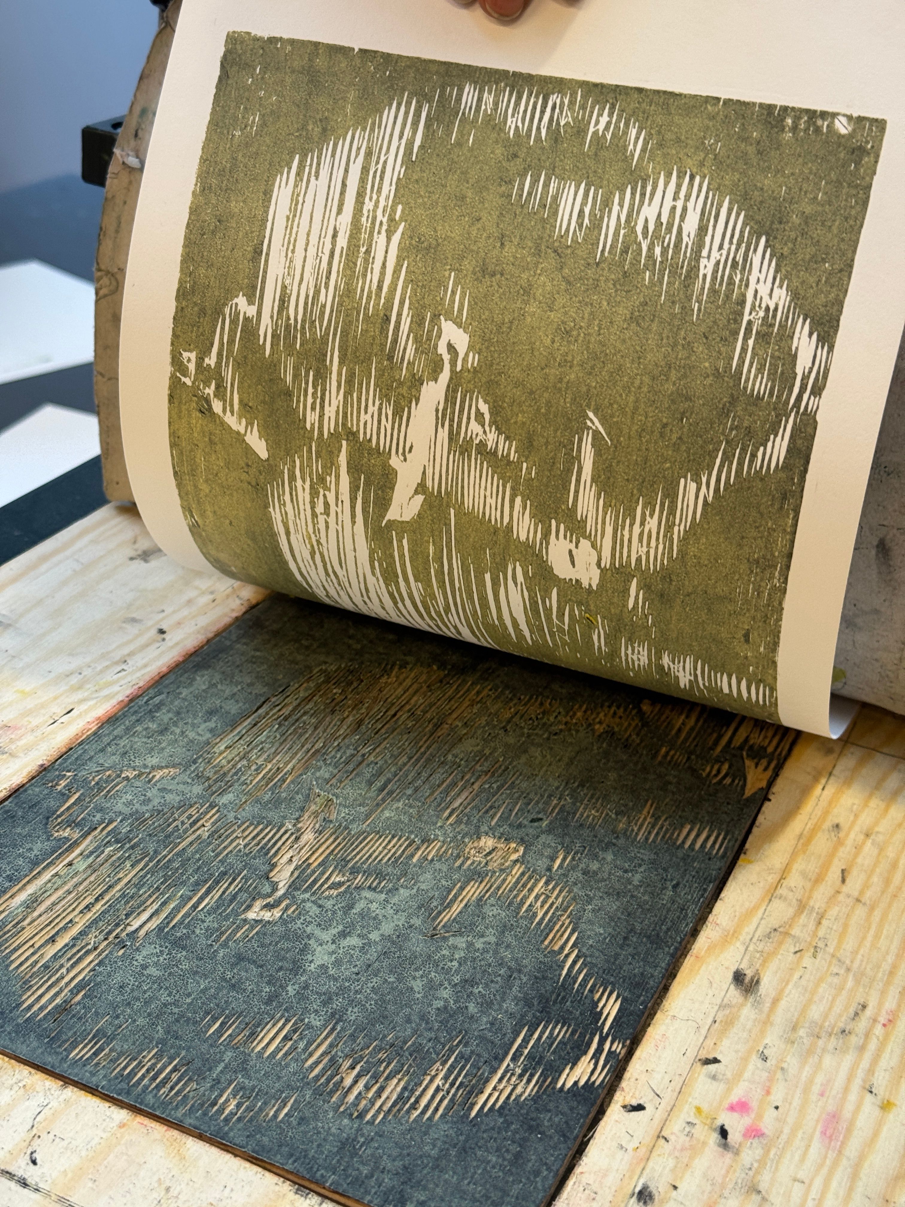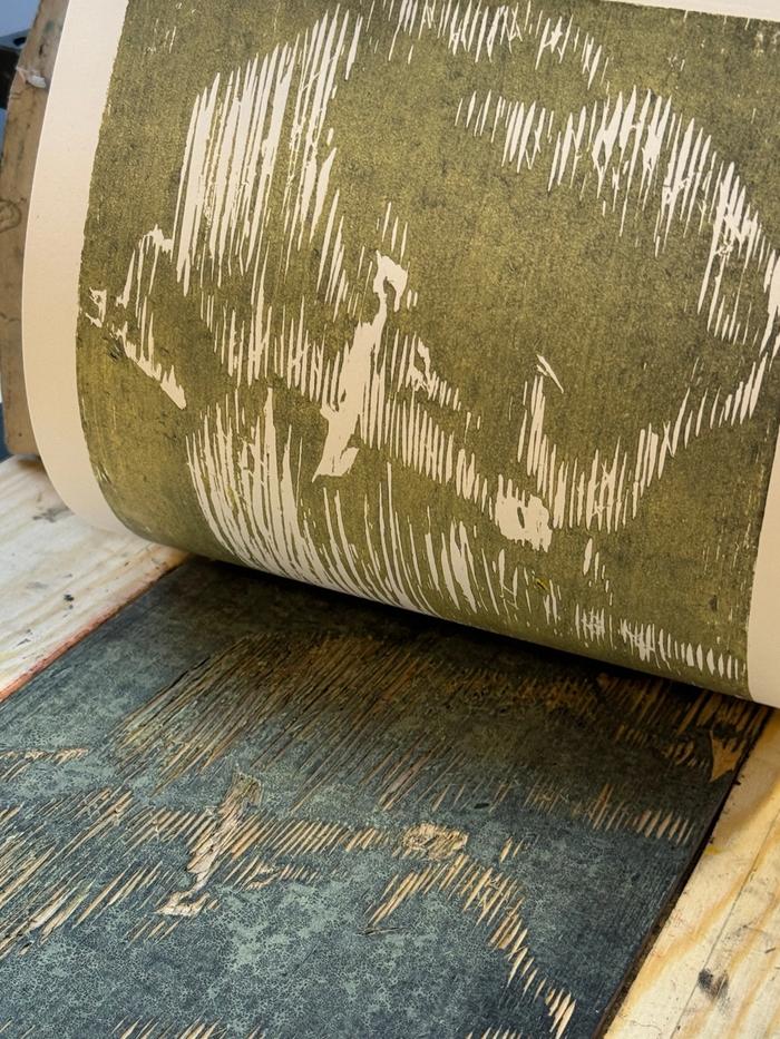 Med utgangspunktet i Iver Jåks verk "Jeg kjørte med nordlyset, sa noaiden" har elever ved Manglerud Skole - International Classes og Blindern vgs IB-linjen jobbet med tresnitt i galleriet. Kunstner og grafiker Marianne Karlsen har ledet kurset.